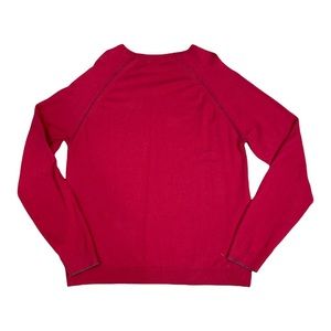 V-neck red cotton/nylon blend sweater, trimmed in gray. Ribbed cuffs, neckline and hem. Size is XXL, which would be a snug fit. VGUC