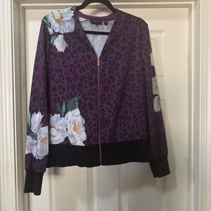 Ted Baker Willow Wilderness Zip Bomber Cardigan in 'black' displays an all-over contrasting pattern of purple leopard print and floral designs and finished with a gold zip closure. Layer over an all-black outfit for a stylish update.