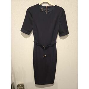 Elevate your wardrobe with this Ted Baker belted Midi Dress, a perfect blend of sophistication and style. The sleek Blue fabric, crafted from a comfortable polyester and elastane blend, drapes elegantly, while the stylish belt cinches the waist for a flattering silhouette. The subtle zip closure adds a touch of modernity, making it ideal for both formal gatherings and chic evening events. This dress is a versatile addition to any fashion-forward woman's collection. New with tags (NWT).