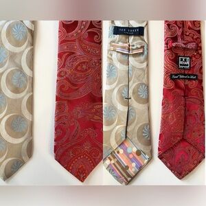 Pinwheel tie is Ted Baker. Red paisley tie is Ike Behar. Very good condition. Sold together.