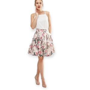 pink floral printed pleated flared skirt