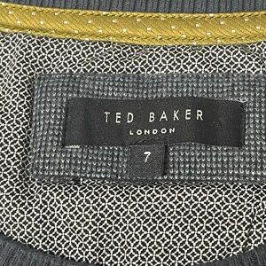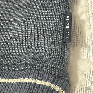 Ted Baker blue sweater with black, olive and cream color stripe accents