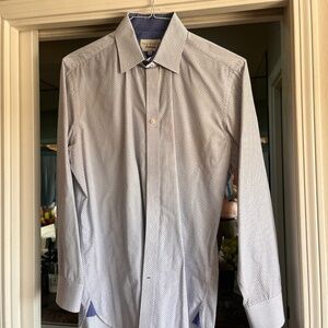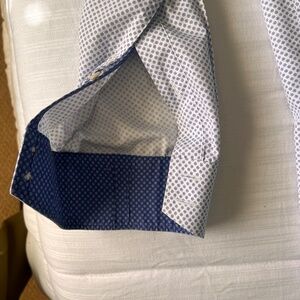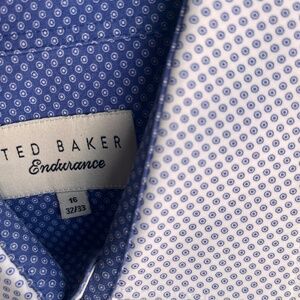 Ted Baker white with blue/gray polka dots dress shirt size 16 with contrast collar and cuffs. Sleeve 32/33. Very good condition.