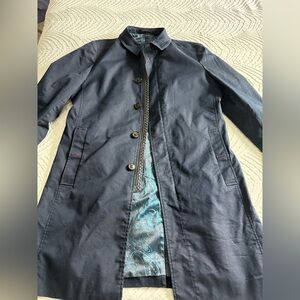 Looks like a Trench coat or jacket . Buttons , zipper and pockets . Size is missing but looks like a S / M