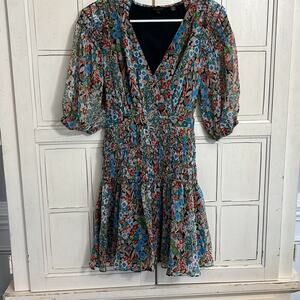 Ted Baker size 0 smocked floral mini dress in excellent condition. Could be tied in the front or back. Black, pink, blue, green and more. Measures 17 1/2” from armpit to armpit. 14” across the waist 12 1/2” across the waist and it is 31” long. Fully lined.