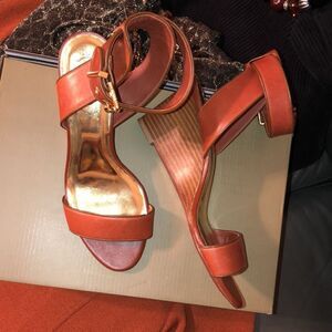 Ted Baker 39 Lernox Camel Brown Trim Stacked Wedge Sandals Gold Tone Hardware