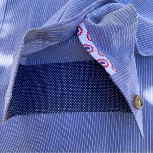 The design of the shirt is a wonderful blue and white micro stripe pattern. The contrast inside collar has a geometric design in blue and orange as well as a darker blue & white polka dot pattern. Inside of cuffs mirror the same collar pattern.
