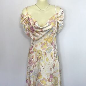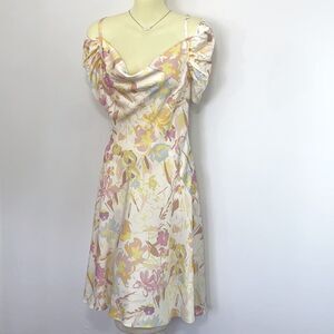 BY TED BAKER LONDON, HERE IS HIS FABULOUS “CAMILY” DRESS THAT IS WONDERFUL FOR ALL YEAR. IT IS 100% VISCOSE AND FELS AND LOOKS LIKER SATIN. IT FEATURES A LOW DRAPE NECK AND RUFFLED CAPPED SLEEVES. IT IS FREE FLOWING WITH ADJUSTABLE LINGERIE STRAPS AND AN ELASTIC BAND FOR FIT IN BACK. NEW WITH TAGS! SIZE TED 3, ABOUT AN 8 U.S. PLEASE NOTE THE MEASUREMENTS