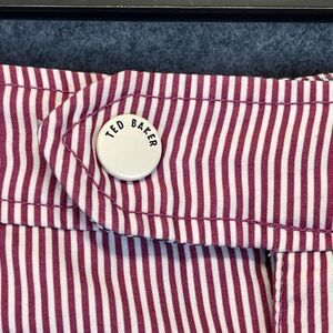 Step up your summer style with these eye-catching Ted Baker London men’s shorts featuring a fine red and white vertical pinstripe pattern and playful signature detailing. These shorts combine classic tailoring with the brand’s quirky charm—perfect for beach days, casual outings, or smart-casual events.
