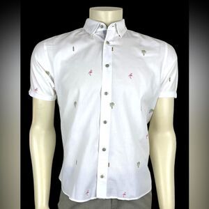 This short sleeved casual button down by Ted Baker is perfect for vacation, or summer gatherings! The white shirt is 100% cotton, and adorned in embroidered flamingos, palm trees, and pineapples. It's in like new condition, and the size 4 (S) measures as follows: