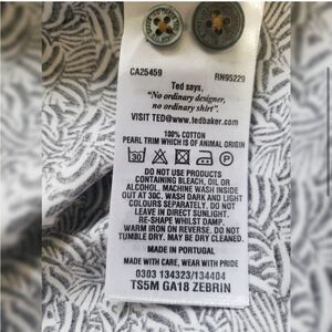 Ted Baker long sleeve collar button up black& white zebra print top 42" bust 28" long Animal print Stock#32