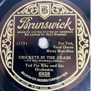 This Brunswick 78 RPM gem featuring Ted Fio Rito and his Orchestra. Side A captures the whimsical "We Went Hunting (The Big Bad Wolf Is Dead)" from "Cockeyed Cavaliers," while Side B brings the vibrant melody of "Crickets In The Grass." Both tracks shine with the vocal talent of Muzzy Marcellino, delivering a fox trot rhythm that resonates across generations.