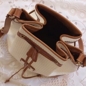 Elevate your handbag wardrobe with this stylish and versatile, this Ted Lapidus bucket bag and wallet features a chic white design and brown leather trim.