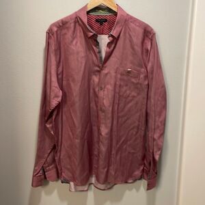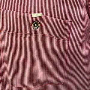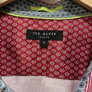 Ted Baker mens red striped button down selling sleeve collared shirt. It has brown and blue pasley accents at the collar and the sleeves. It’s a size 7. It’s super cute and in good condition.