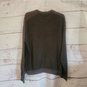 Charcoal gray, army green and black wool blend sweater solid stripe down each sleeve and solid hem. In very good condition.