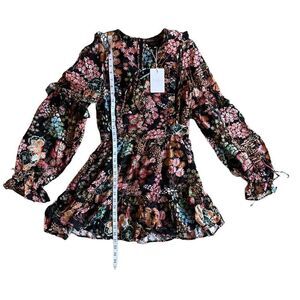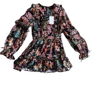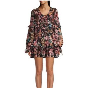 Crafted from floral chiffon, this ruffle-trim mini dress is designed with retro appeal.