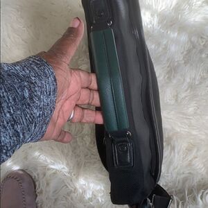 Black canvas bag with green faux leather handle and zipper end. This bag has so many compartment inside and outside. Very clean and in great condition.