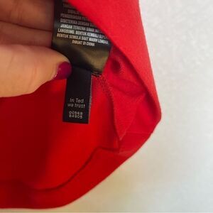 •Features: Red/orange tunic dress with silk overhang that splits in the back. Gold exposed zipper.