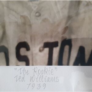 Fantastic 1939 rookie portrait of Ted William's with his Boston "B" cap. In his mind, he's already the greatest hitter who ever lived. The bleachers and his road Boston flannel are a blur by design, further enhancing the clarity and importance of this artwork.
