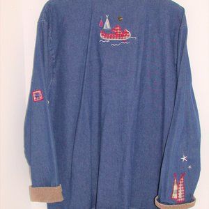 This cute jacket is made of Denim and trimmed with khaki corduroy, embroidery, and applique. It is in excellent condition. Size XL.