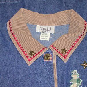 Teddi Denim Embroidered & Appliqued Button Front Jacket Corduroy Trim ~ Size XL