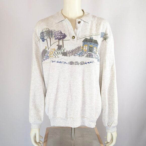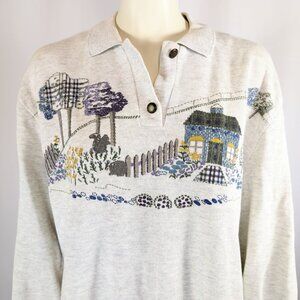 Teddi 🏡 Size: XL. 90s ladies collared top featuring a print of a farm homestead. Good condition, seems small for an XL, message me for measurements. Middle button is missing, see pictures.