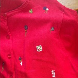 Stylish red cardigan with intricate embroidery. Features a classic button-up design.