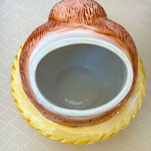Adorable Country Bear Cookie Jar made by “Everyday Gibson”, measuring 9” x 11”. Dressed I. Blue overalls and a straw looking basket hat. Just the place to store mom’s homemade cookies in.