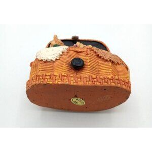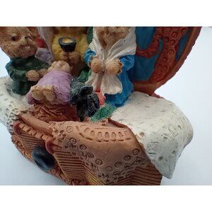 This is an absolutely charming knick knack that should be on your shelf! A tiny teddy bear family sits inside of a sewing basket. The details are intricate and adorable. Sewing tools and fabric surround the miniature characters. A delightful addition to any collection or as a centerpiece for decor enthusiasts. This would also make a great gift for the crafty person in your life!