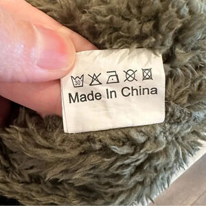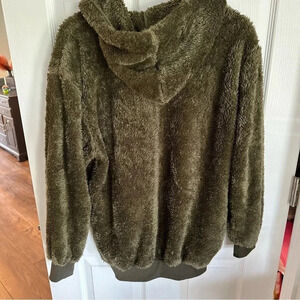 Very Cozy and warm long sleeve fuzzy sweater olive green in color, Quarter zip closure with ties to pull hood tight. Excellent pre owned condition