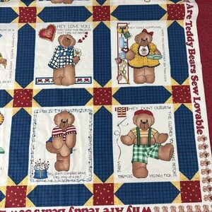 Charming quilt pattern cut and sew featuring adorable teddy bear designs. Accented with blue and red patterns. Perfect for that one who loves sewing. All measurements are approximate. Smoke free home. Vintage from 1996. Always wash fabric before sewing to prevent shrinkage in the future.