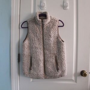 "miami" brand, and a size small. This is a very warm, gray and fluffy vest with pockets in the front that can be zipped to secure belongings.100% polyester
