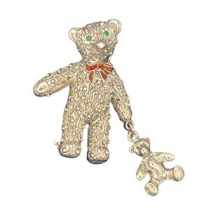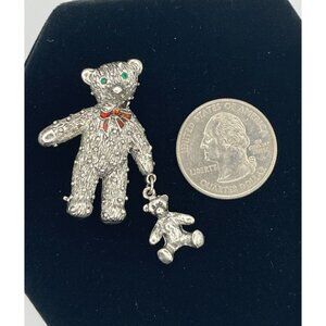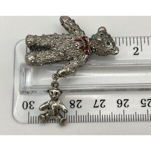Adorable textured silver-tone teddy bear brooch with a charming red bow and sparkling green eyes, perfect for adding a touch of whimsy to any outfit.