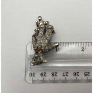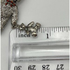 Teddy Bears Brooch Textured Silver Tone Metal Red Bow Green Eyes
