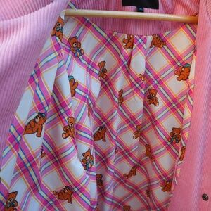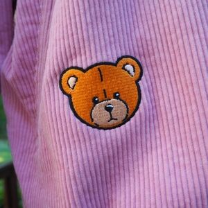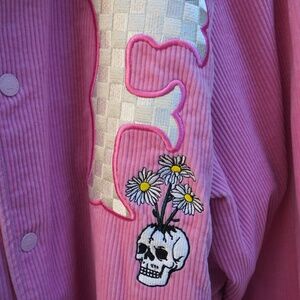 Teddy Fresh women’s pink varsity corduroy jacket in 3x. Shell is 100% cotton. Lining is 100% polyester. From a clean non-smoking house. Pink, Preloved.