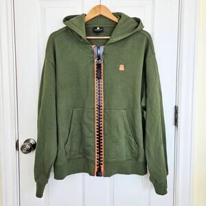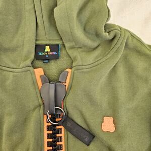 Oversized army green jersey knit hoodie by the brand Teddy Fresh. Features a large black zipper with orange details and a branded black zipper pull, an orange rubber teddy bear logo on the chest, and green bear ears on the hood that match the rest of the hoodie. Labeled as a size medium. See measurements. Material is 100% cotton.