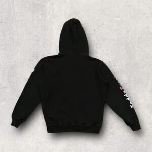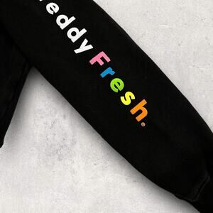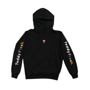 The letter "T" is prominently featured in the center of the chest, representing the first letter of Teddy Fresh, making the design both unique and brand-centric. The rainbow lettering along the sleeves adds a playful and vibrant touch, which is a signature element of Teddy Fresh's design approach. The black base provides a neutral background that allows the rainbow letters to pop, making this hoodie stand out while still being versatile. 🌈✨