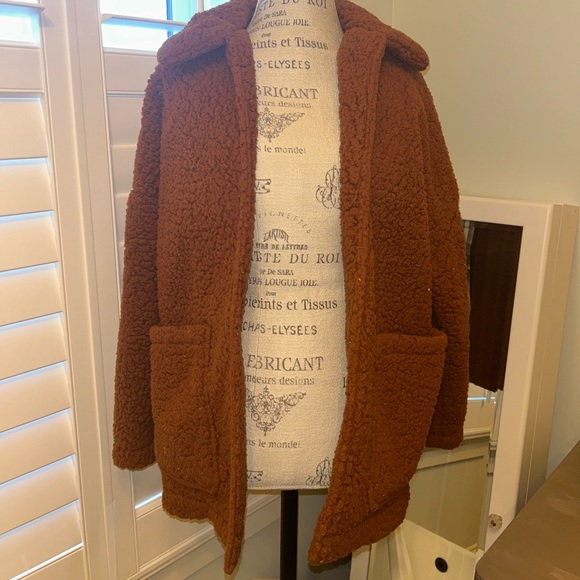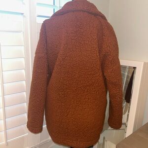 Super cute brown teddy jacket! Left pocket has some stitching undone as pictured. Easily fixable and not very noticeable!