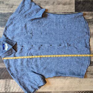 This is a light heathered grey Teddy Stratford shirt in a similar style to the Raider Shirt. It is in excellent condition. It is a Teddy 6, aka size XXL, and the last three images show measurements. Soft 100% cotton fabric. Short sleeves, point collar, chest patch pockets with button flap closure. Athletic/slim fit, tapered towards the midsection fitting closer to the body. The zipper closure prevents the shirt from pulling open and gapping around the buttons.