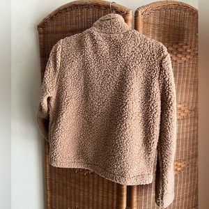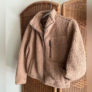Boutique brand tan teddy bear fleece jacket. Zipper chest pocket, side pockets, high collar neck.