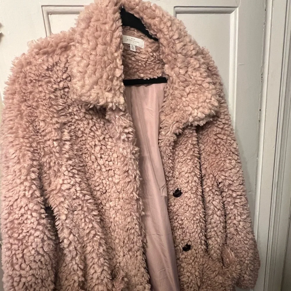 Worn only once. Super comfy and cozy and obviously cute. It’s more of a muted pink color. The first photo looks like the true color of the jacket.