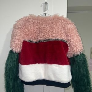Teddy & shag material jacket, no size tag but fits a small/medium. Never worn by me purchased from a thrift store. No wear or damage