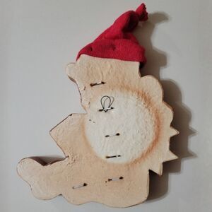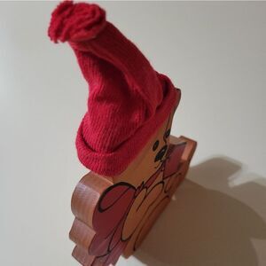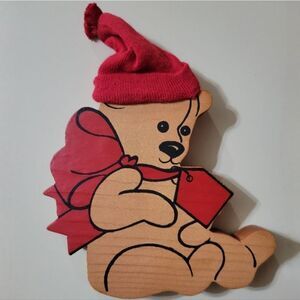 This vintage wood resin wall plaque features a sweet teddybear wearing a red knit stocking hat, a big red bow, and a gifttag. The plaque can be hung or displayed freestanding. It is a perfect addition for any bear collector, a child's room, or can be mixed with your holiday decor. The gift tag is blank and could be personalized. Excellent vintage condition.