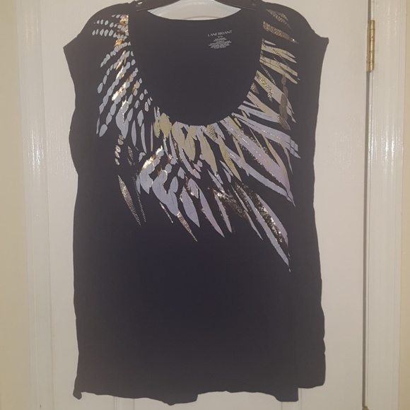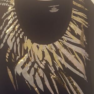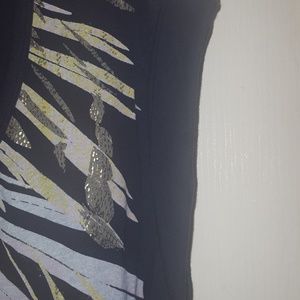 Navy blue tee with gold and pastel color splashes on the front. Short sleeve with a cuff and a split on the side