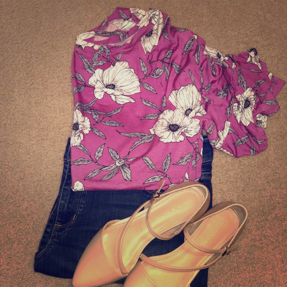 Tee in good condition. Pink background with gray and white floral design. This tee also has a ruffle sleeve