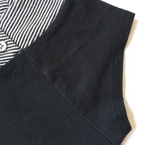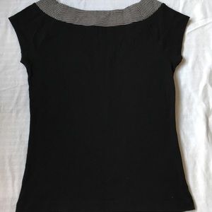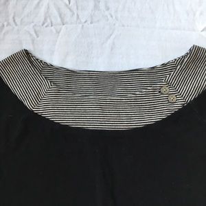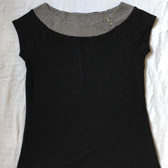 Cap sleeve tee with black and white striped neck band with 2 button adornment.