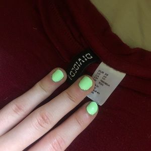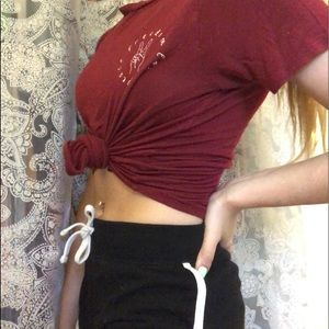 Hippie maroon tee, soft, stretchy, has peace sign w wording in the top corner