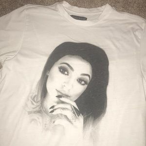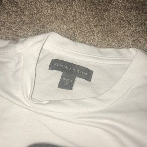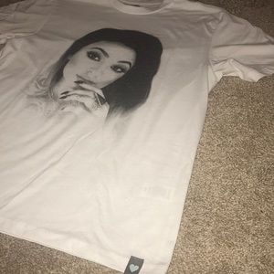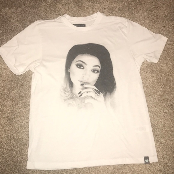 This is a white slightly oversized tee with Kylie Jenner on it. I have only worn this a couple of times. This shirt was bought from Pacsun and was part of the Kendall and Kylie collection. This shirt is simple and will match with anything! It is also in GREAT condition and very stylish for your day!