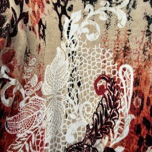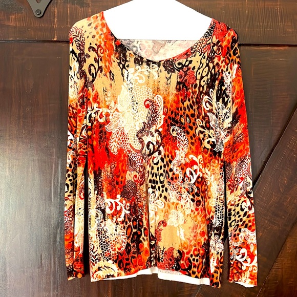 This is a fine gauge sweater tee. Perfect for Fall, great with black pants. 53% Cotton,40% Rayon, 7% nylon. Machine wash/dry. Print on front and back. Chico’s size 1 which is like a 6-8.