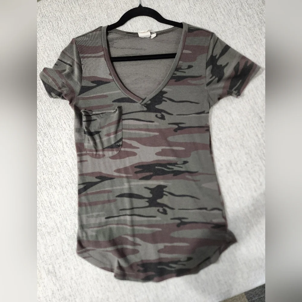 super soft and comfortable womens camo vneck tee with pocket. size xs.